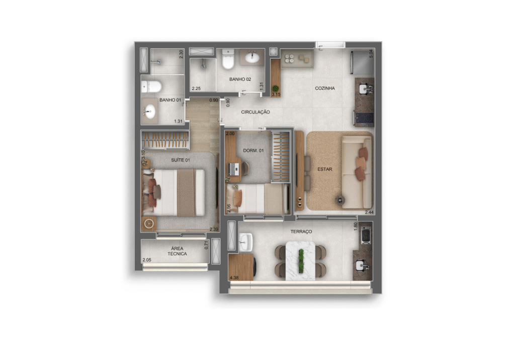 Apartamento 53m² · 2 dorms (1 Suíte)